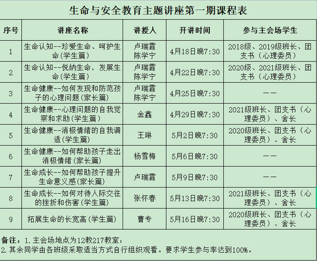 2.其余同学,由各班级采取适当方式,自行组织观看。所有针对学生的课程,要求实现学生参与率100%。请各辅导员于讲座次日在群内上报参与活动人数。