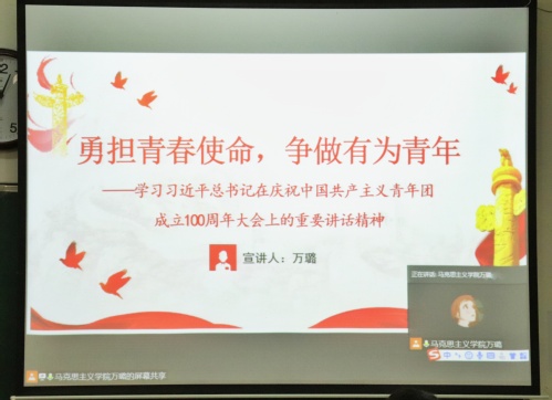 万璐就习近平总书记在庆祝中国共产主义青年团成立100周年大会上的重要讲话详细地介绍了习近平总书记对当代青年寄予殷切期望,新时代的团员青年要做到“五个模范”。