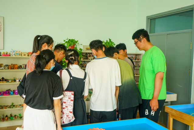 随后来到大学生心理健康协会。心理健康协会的同学介绍协会的功能和协会各个部门的作用。同时带领大家参观心理中心的沙盘游戏室、情绪减压室、教育培训室等等帮助同学解压的教室。