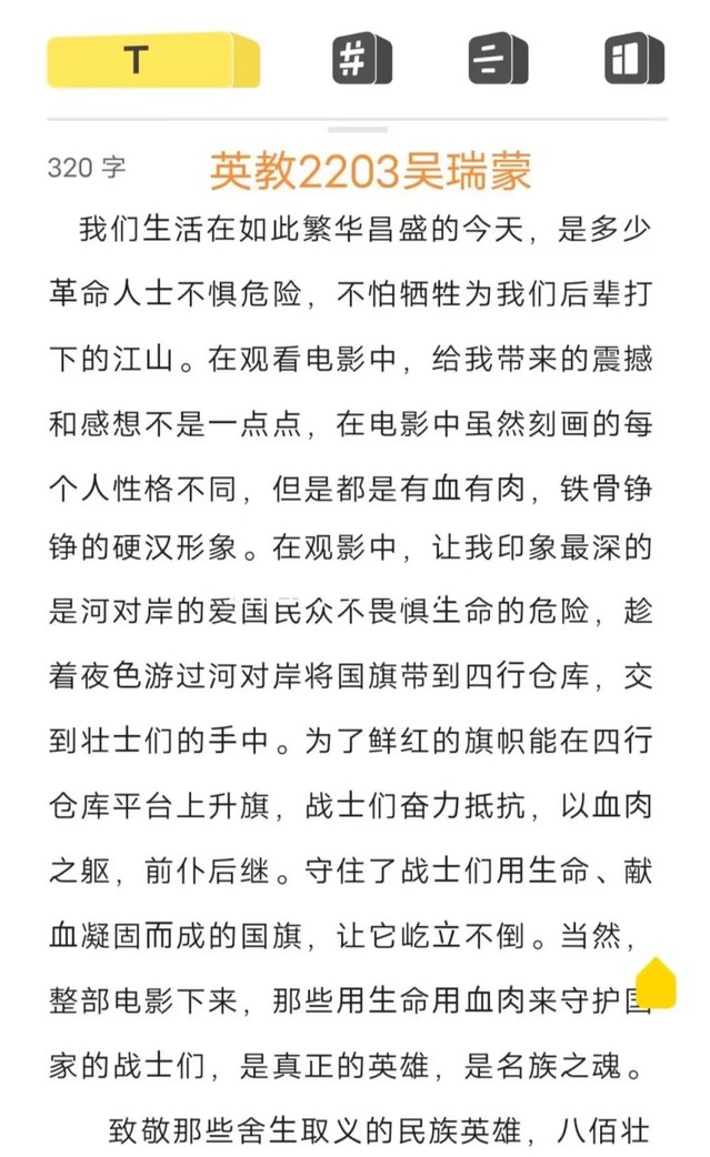 电影放映结束后,工作人员在活动群里新建了群相册,同学们热情高涨,不禁书写出了自己的爱国情怀,每个同学提交了红色电影观后感,同学们用自己激昂的文字书写出了自己的观影感触。