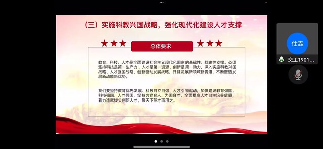 会议的第二部分由崔仕垚同志带领大家学习党的二十大报告内容。一是全面建设社会主义现代化国家,二是加快构建新发展格局,着力推动高质量发展,三是要实施科教兴国战略,强化现代化建设人才支撑,四是发展全过程人民民主,保障人民当家作主,五是坚持全面依法治国,推进法治中国建设。全体党员对二十大报告的内容有了更深层次的解读。
