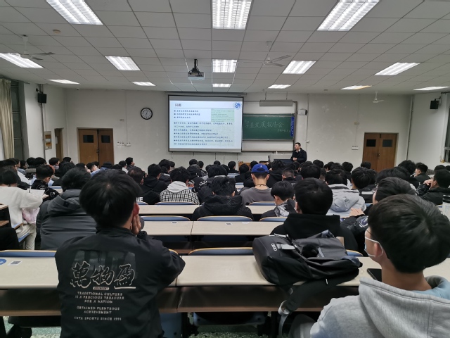 会议伊始,杨坤老师从本专业特色及发展方向、不同的研究方向及所学内容、考研或就业去向三个问题出发,为同学们进行详细地解答。接着从专业背景方面介绍了该专业的优势,又从专业发展历程出发,向同学们展现了本专业的科研成果、获奖项目和专业认可度调查等许多科学研究成绩,提高了本专业同学们的自信心。杨坤又详细地介绍了专业研究方向以及专业培养方案,使同学们对所学的课程有了更深刻的理解,也有了更清晰的奋斗目标。随后,杨坤从就业和考研两方面介绍毕业去向,帮助同学们更好的确定未来发展目标。此外,杨坤还向同学们介绍了多名来自全国各地的知名校友,激励同学们以他们为榜样,奋发学习。最后,杨坤在学习注意事项方面以真实的案例作为出发点,就同学们关心的学风问题、挂科问题、心态问题、礼貌问题等提出了相应的改善措施,同时,他提出对同学们的希望,专业是大家职业发展有力后盾,专业建设人人都不是局外人,需要大家共同努力。