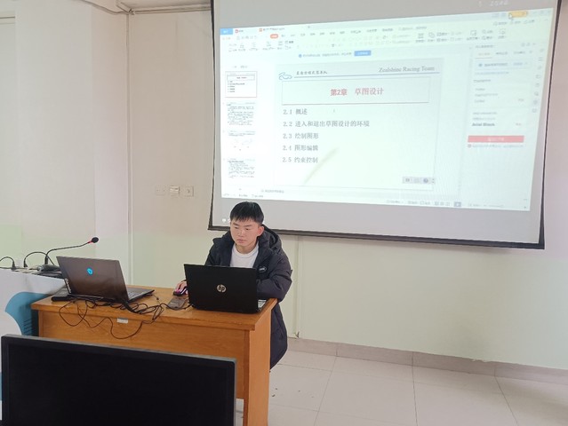 首先,队员朱泓楷先向大家介绍了CATIA的基本功能,带领大家熟悉软件使用的流程,接下来,队员庞博豪从草图设计绘制,图形编辑约束等方面向大家讲授基本二维模型绘制,为后期三维图形建模奠定基础,其他技术组队员在教室内巡回巡视,积极解答大家在学习过程中的问题。