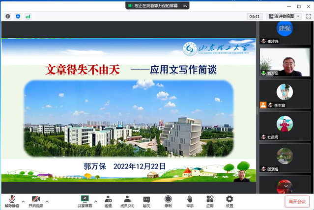 郭万保以“文章得失不由天——应用文写作简谈”为题,从什么是应用文写作、几种应用文体的写作、应用文写作的几点体会等三个方面作报告。他从思想政治、内容、文字表述、程式、时限等方面讲明了应用文写作的基本要求;结合具体例子,阐释了通知、通报、计划、总结等多种不同应用文体的特征和写作方法;结合个人的写作经验,从勤学习、深思考、多实践、精修改等方面详细讲解了提升写作素质的方法路径。郭万保表示,要想提升写作水平,要遵循一万小时定律,多学多读、多思多问、多抄多记,多写多练、多改多悟、多熬多成。