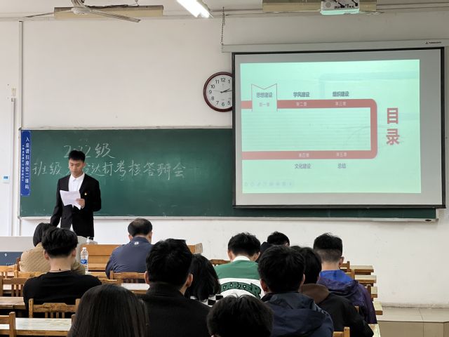 为全面总结上一学期班级建设成果,更好地开展新学期班级建设工作,5月4日下午,学院在12号教学楼分年级举行2022-2023学年第一学期班级建设达标考核答辩会,学院团委书记高萌、学生工作办公室全体辅导员在各年级答辩会场担任评委,学院本科年级部分班委参加答辩会。