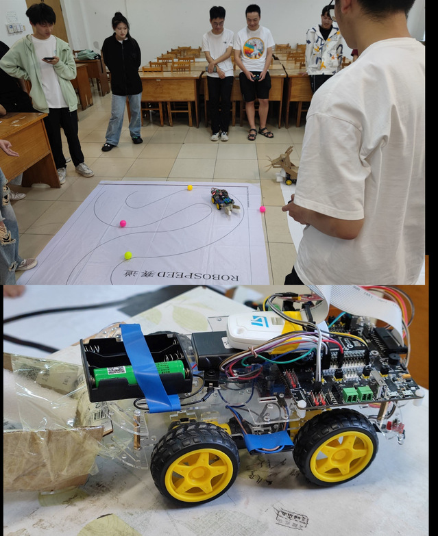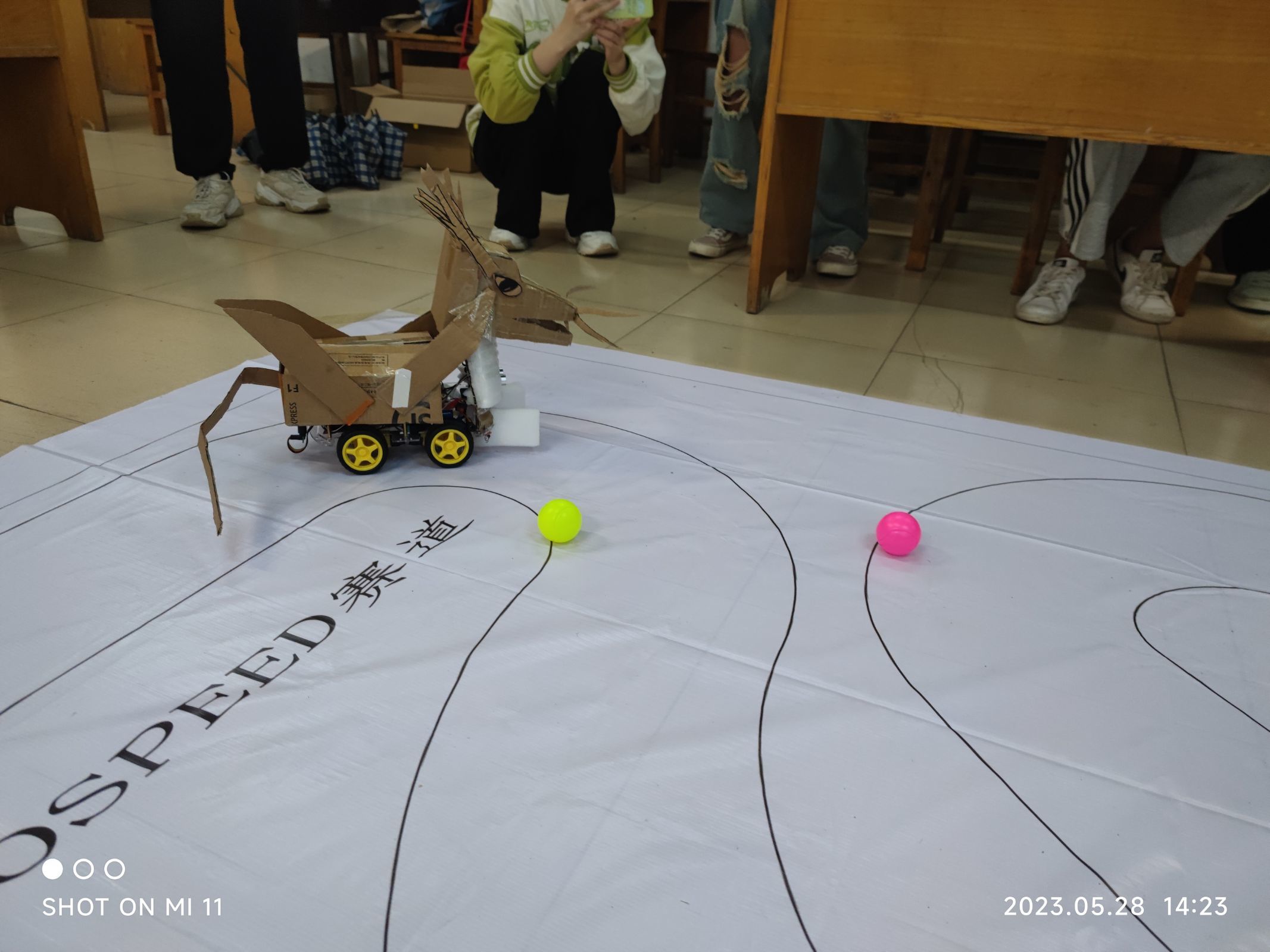 此次比赛分为三部分。第一部分赛道竞速,参赛选手遥控小车完成赛道。用时最短者获胜。第二部分推小球,两组队伍分别遥控小车进行对抗。推动小球至指定的球框。进球多的一组获胜。最终角逐出排名。第三部分循迹小车,参赛小车将小车放置在起点,由小车自主跟寻黑色线条行走至终点,用时最短者获胜。