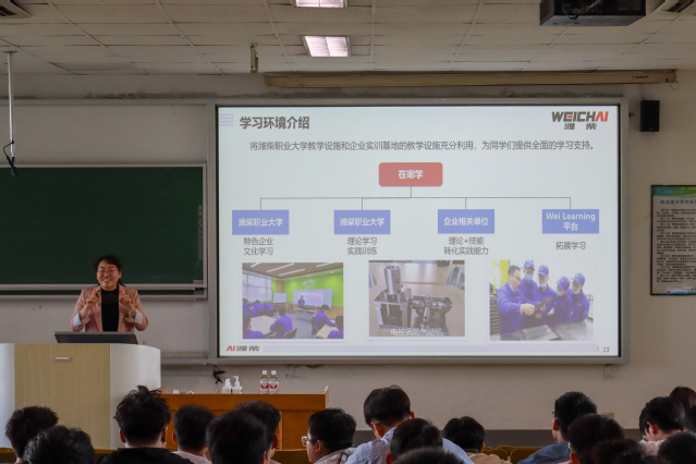 潍柴现代产业学院负责人管丽芳对潍柴产业学院及校企合作进行了相关介绍。她从企业起源、发展、业务板块、全球发展、科技创新成果、企业文化、战略目标等方面介绍了潍柴集团,着重介绍了潍柴现代产业学院的校企合作模式,对教学规划、培养机制、基本薪资、福利体系进行了详细介绍。最后,她鼓励同学们积极参与“潍柴精英班”的选拔,并欢迎大家到潍柴现代产业学院参观学习。
