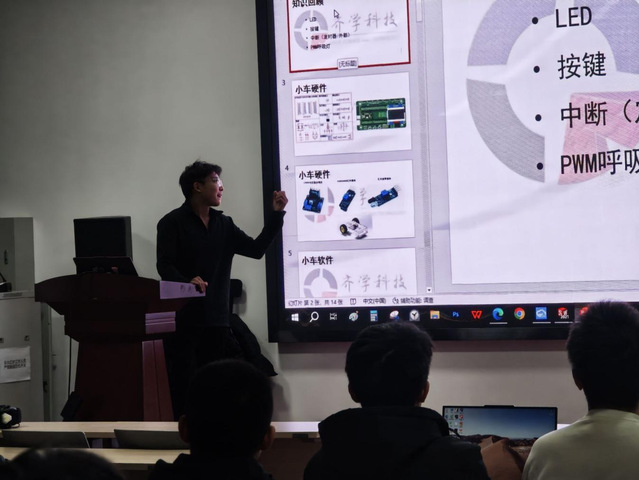 首先讲解的是小车硬件部分,他给大家展示了制作小车需要的外置配件以及讲解了PWM知识。简单概括了小车制作硬件部分的流程,将知识点讲明白了。