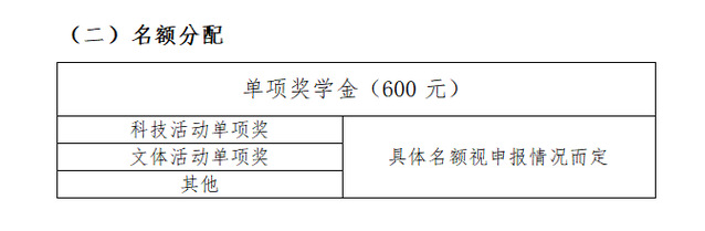 3.其他:积极参与组织学校各项集体活动,有较强的社会工作能力,取得突出成绩;积极参与社会公益活动,表现突出,为学校赢得荣誉;具有见义勇为、助人为乐、拾金不昧等行为,受到有关部门表扬者,学校将分别给予奖励。