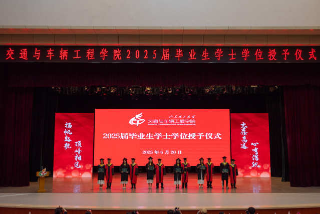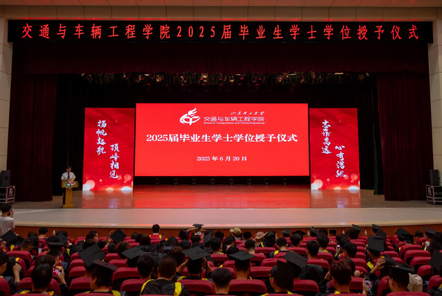 6月20日上午,交通学院在大学生艺术中心大礼堂举办2025届毕业生学位授予仪式。学院领导班子成员、各系部室主任、教师代表、辅导员及2025届全体毕业生参加仪式。仪式由学院党委书记褚兆勇主持。