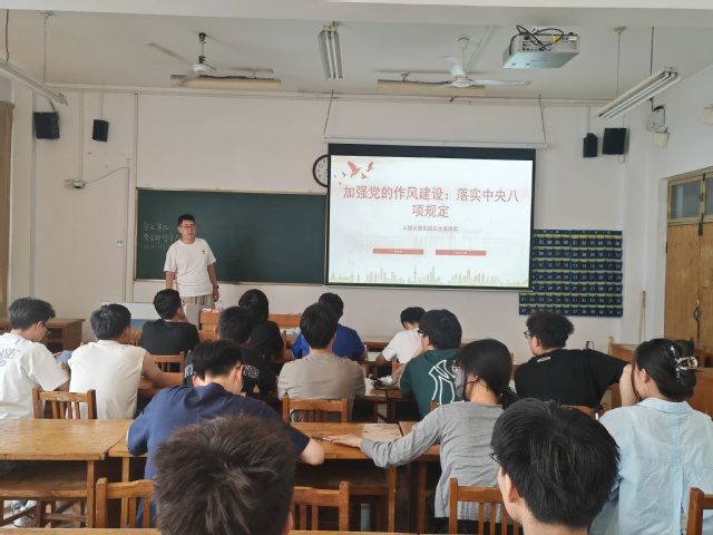学生第五党支部书记张仕杰讲授了题为“加强党的作风建设:落实中央八项规定精神”的专题党课。