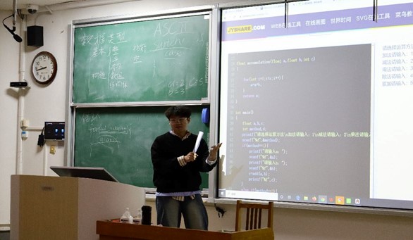 然后,陈宇航通过板书与电脑实操相结合的方式,细致讲解C语言中的if语句和循环语句,同学们认真听讲,记录笔记,并且频繁互动,学习氛围浓厚。
