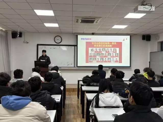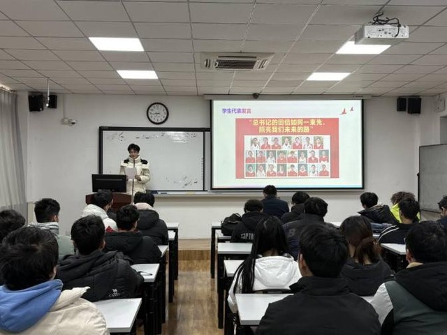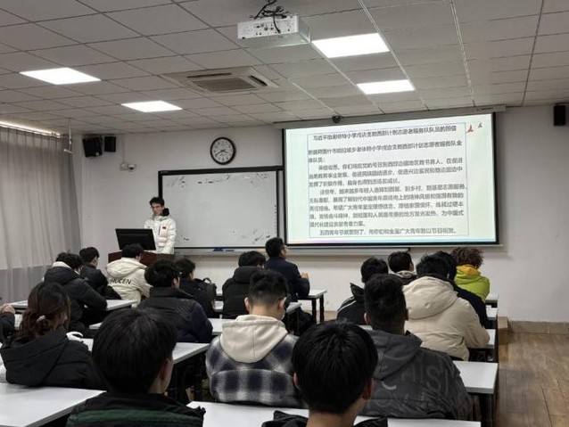 随后,翟洪栋同学带领大家学习了习近平总书记给新疆阿图什市哈拉峻乡谢依特小学戍边支教西部计划志愿者服务队队员的回信。总书记的殷切寄语温暖人心、催人奋进,在同学中引发热烈反响。学生代表赵文哲、郑博函结合专业与个人思考,分享了学习感悟。他们表示,总书记的回信为青年投身西部建设指明了方向,作为交通专业学子,应勇担使命,未来若有机会参加西部计划,必将发挥专业特长,以实际行动践行志愿精神。班会还组织全体同学齐声诵读志愿者誓词,在庄严的誓言中坚定奉献祖国的决心。